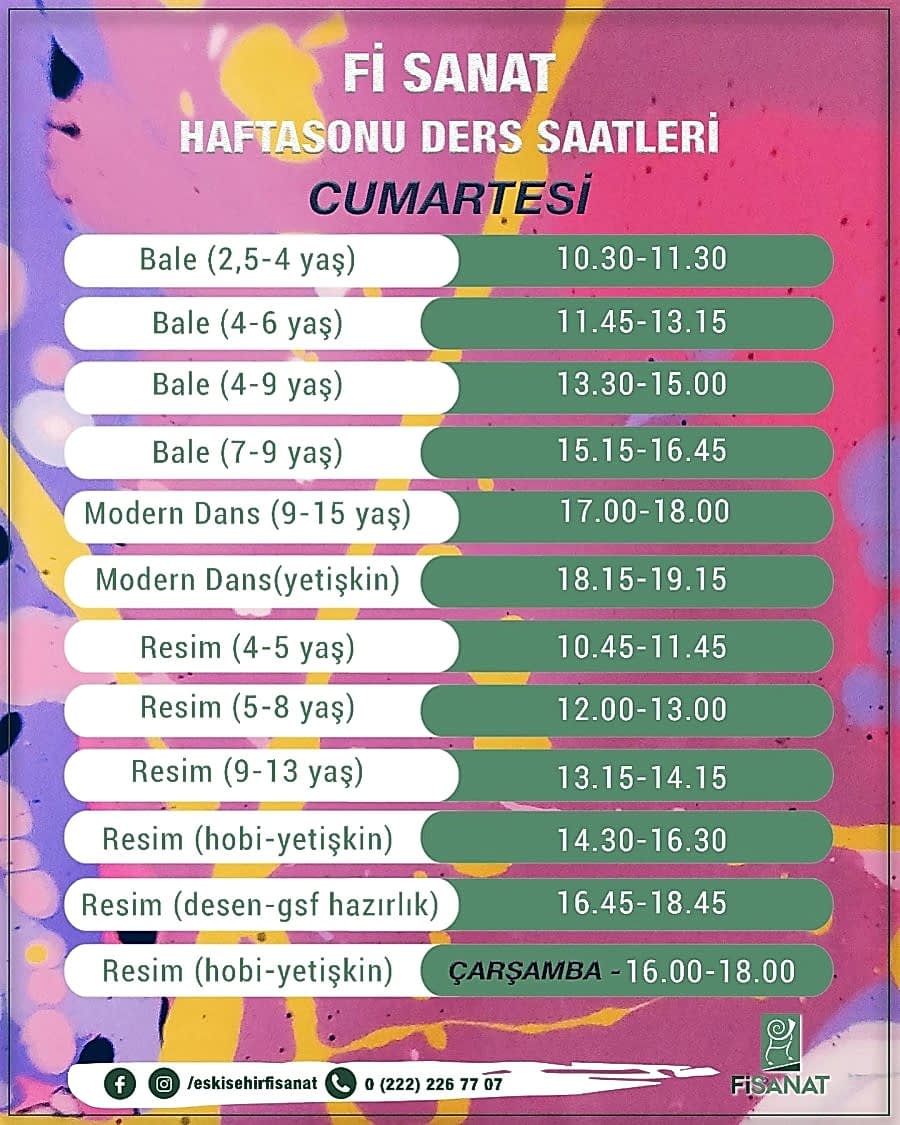 Yeni dönem ders saatlerimiz listedeki gibidir. 14-15 Eylül haftası deneme derslerimize katılan öğrencilerimiz öğretmenlerimizin sizlere verdiği ders saatlerinde katılım gerçekleştirmenizi rica ediyoruz. Yeni gelebilecek öğrencilerimiz ise listedeki saatlere göre derslerimize katılım sağlayabilirsiniz. Bale dersine yeni başlayacak 4 yaş üzeri öğrencilerimiz 4-9 yaş grubu bale ders saatine gelebilirsiniz. Detaylı bilgi ve Bireysel enstrüman dersi almak isteyen öğrencilerimiz ise